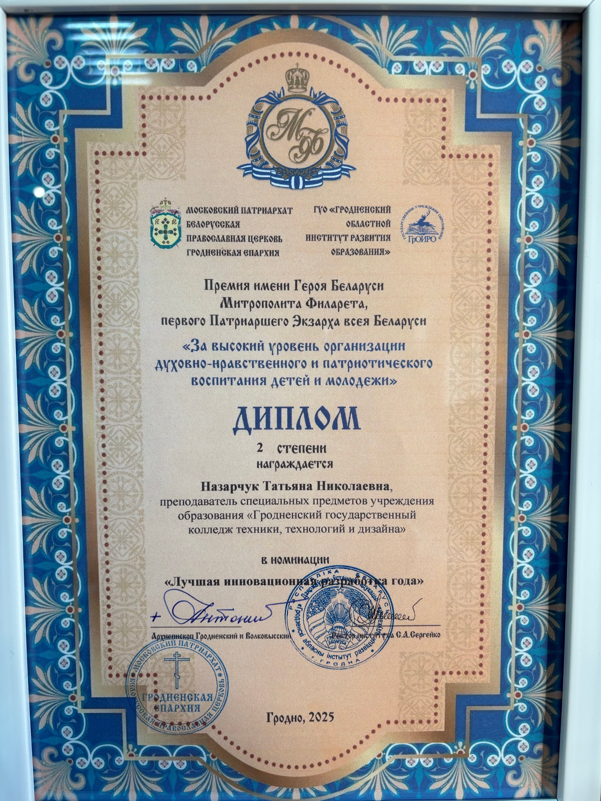 22 декабря 2025 года в Гродненском областном институте развития образования состоялась церемония вручения Премии имени Героя Беларуси Митрополита Филарета, первого Патриаршего Экзарха всея Беларуси, «За высокий уровень организации духовно-нравственного и патриотического воспитания детей и молодежи». Преподаватель Татьяна Николаевна Назарчук награждена дипломом 2 степени в номинации «Лучшая инновационная разработка года”. Премия учреждена в 2021 году по инициативе архиепископа Гродненского и Волковысского Антония, личного секретаря и келейника первого Патриаршего Экзарха всея Беларуси, Гродненской, Лидской, Новогрудской епархиями Белорусской православной церкви, Гродненским областным институтом развития образования при поддержке Главного управления образования Гродненского областного исполнительного комитета. Она вручается педагогическим работникам, священнослужителям, педагогам воскресных школ, показавшим высокое качество духовно-нравственного и патриотического воспитания обучающихся. Победители определяются в номинациях: «Труд педагога как служение», «Лучшая инновационная разработка года», «Лучшая система духовно-нравственного и патриотического воспитания детей и молодежи», «Взрастившему педагога». В 2025 году премия вручается уже в пятый раз. В конкурсе принимали участие претенденты из учреждений образования, расположенных на территории Гродненской, Новогрудской и Лидской епархий Белорусской Православной Церкви. Перед торжественной церемонией вручения премии призеры конкурса подготовили интерактивную выставку своих проектов.