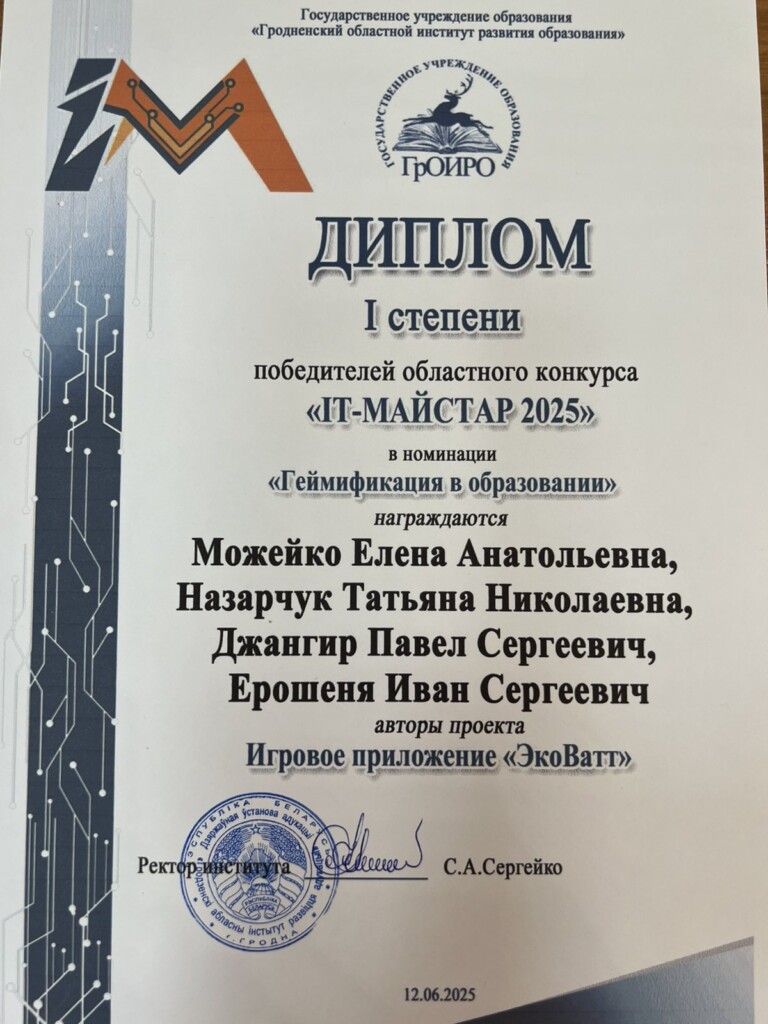 25 августа 2025 года на базе Гродненского областного института развития образования состоялась церемония награждения победителей и призёров областного конкурса с международным участием “IT-мастер-2025”. Среди победителей в номинации “Геймификация в образовании” наши педагоги и учащиеся. Поздравляем Можейко Е. А. и Назарчук Т. Н., желаем новых побед!