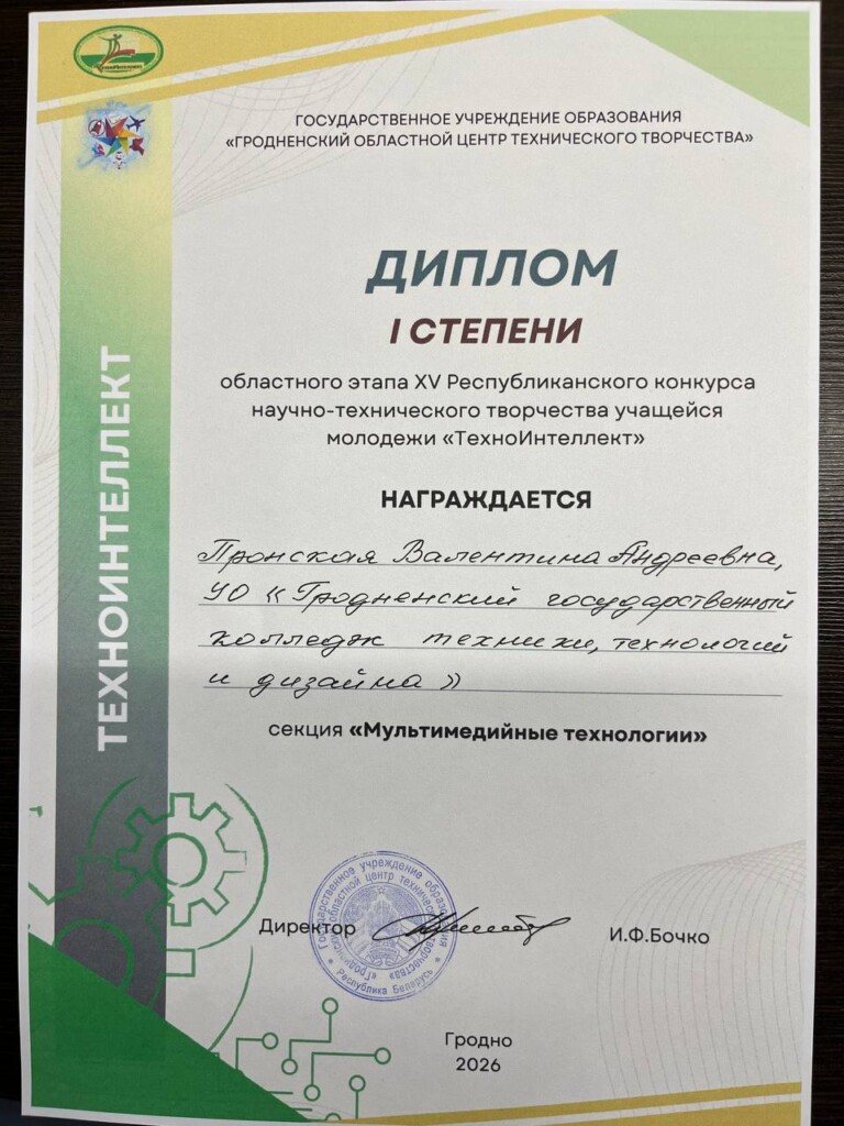 В секции «Мультимедийные технологии» дипломом 1 степени была награждена Валентина Пронская за проект «Интерактивное образовательное приложение «Маленький патриот»» (руководитель Можейко Е.А.).